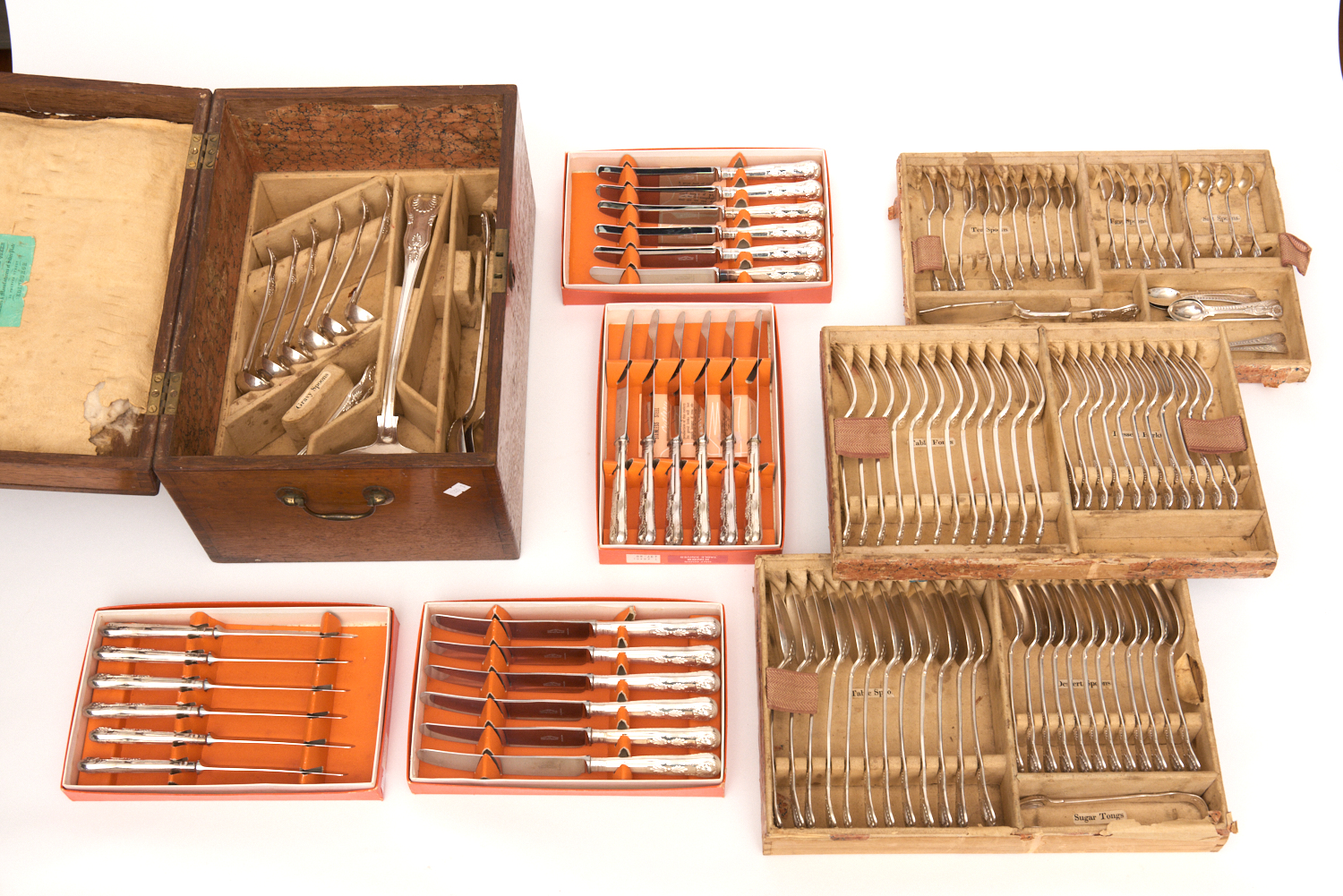 A VICTORIAN STERLING SILVER KINGS PATTERN FLATWARE SETTING FOR 12 IN OAK CANTEEN, HALLMARKED LONDON, 1855, ELIZABETH EATON WITH 'MCKAY CUNNINGHAM & CO' LABEL AFFIXED TO LID. FOUR FITTED TIERS CONSISTING OF: 12 DINNER FORKS, 11 DESSERT FORKS, 12 TABLE SPOONS, 11 DESSERT SPOONS, SUGAR TONGS, SOUP LADLE, 6 TODDY SPOONS, 2 GRAVY SPOONS, 2 SERVING SPOONS, 5 LARGE TEASPOONS, 5 SMALL TEASPOONS, 4 SALT SPOONS, 5 EGG SPOONS, 1 BUTTER KNIFE, 10 COFFEE SPOONS (DIFFERENT MAKER) TOGETHER WITH SILVER PLATED KNIVES IN SAME PATTERN