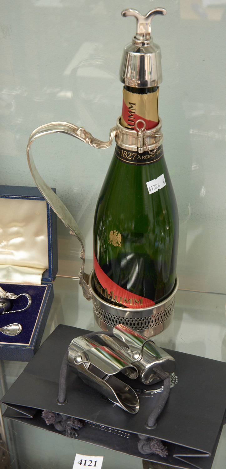 AN EPNS CHAMPAGNE CADDY AND TWO GEORG JENSEN STAINLESS STEEL WINE STOPPERS