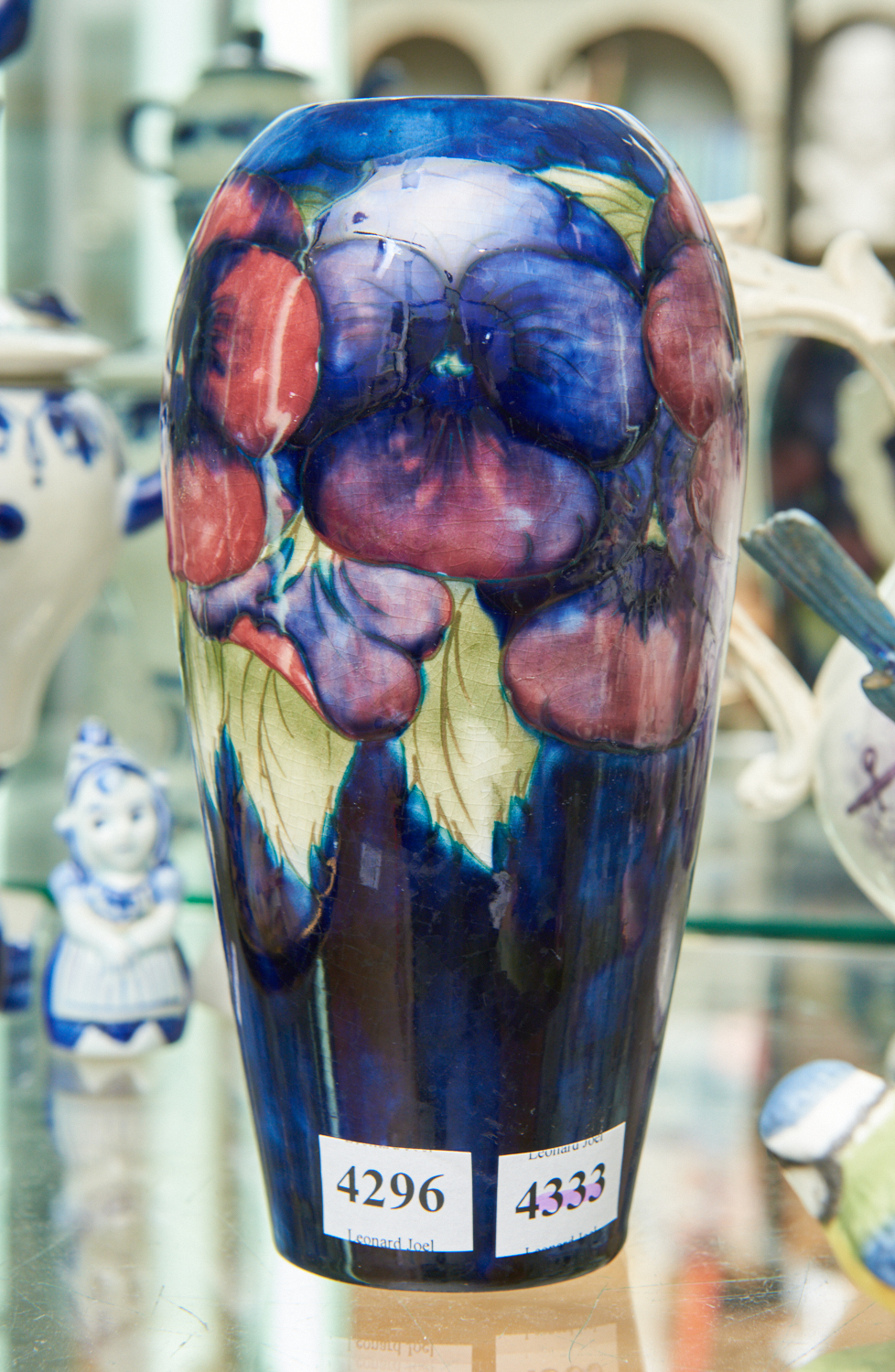 A MOORCROFT 'PANSY' PATTERN VASE ON BLUE GROUND, CIRCA 1930s, IMPRESSED 'MOORCROFT, MADE IN ENGLAND', 18.5CM HIGH