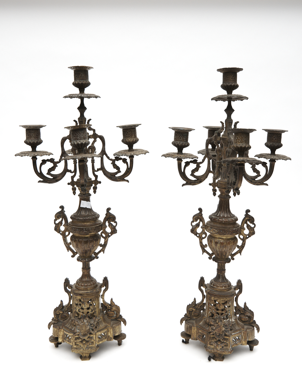 A PAIR OF FRENCH ORMOLU FIVE BRANCH CANDELABRAS, 19TH CENTURY, 52CM HIGH