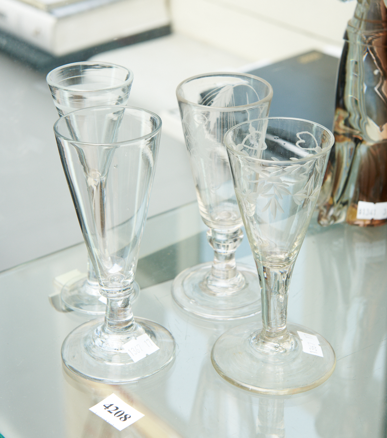 FOUR GEORGIAN CORDIAL AND WINE GLASSES, 18TH CENTURY, TALLEST 14.5CM HIGH