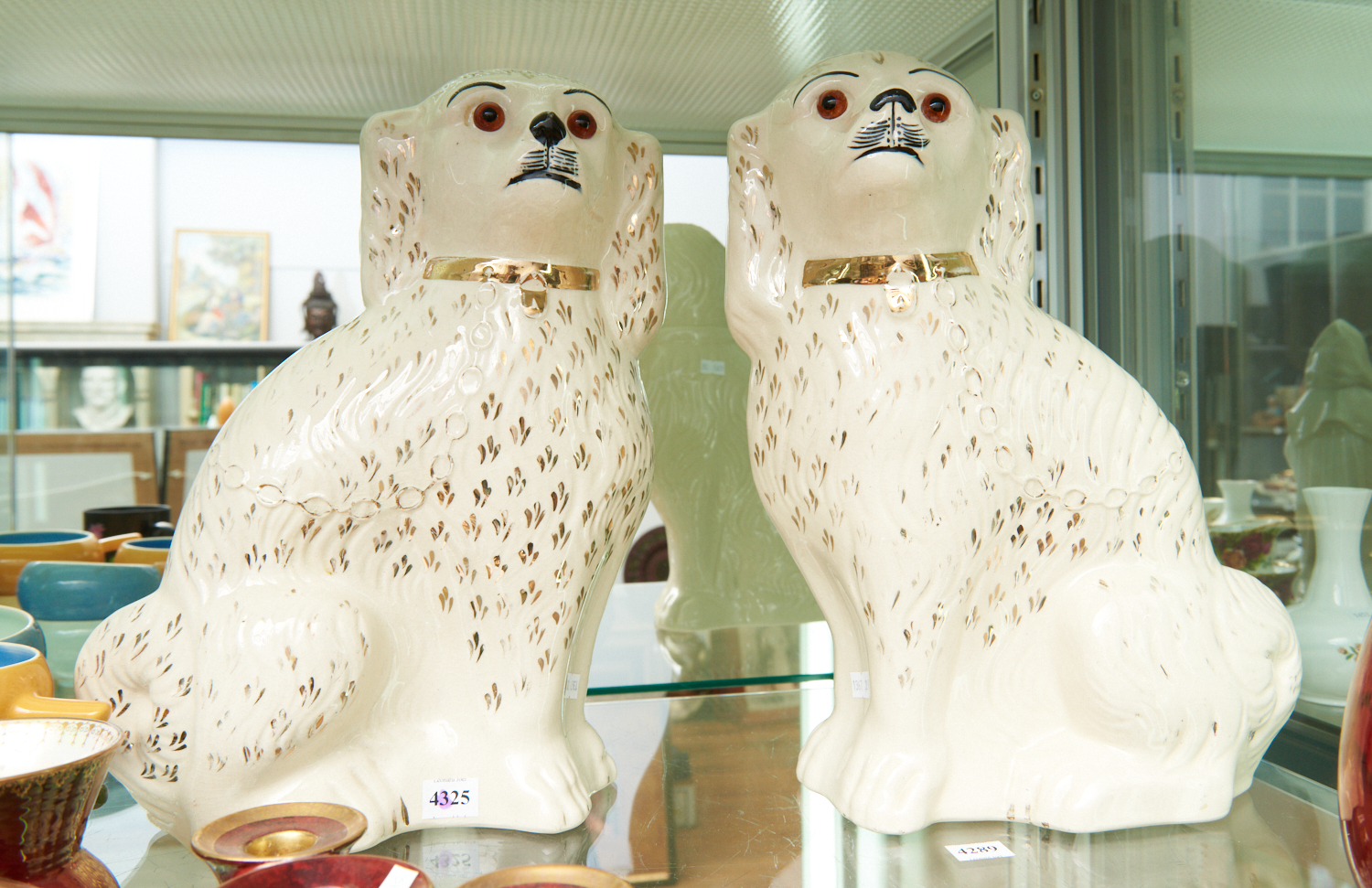 A PAIR OF STAFFORDSHIRE PORCELAIN SPANIEL STATUES, MID 19TH CENTURY, 36CM HIGH