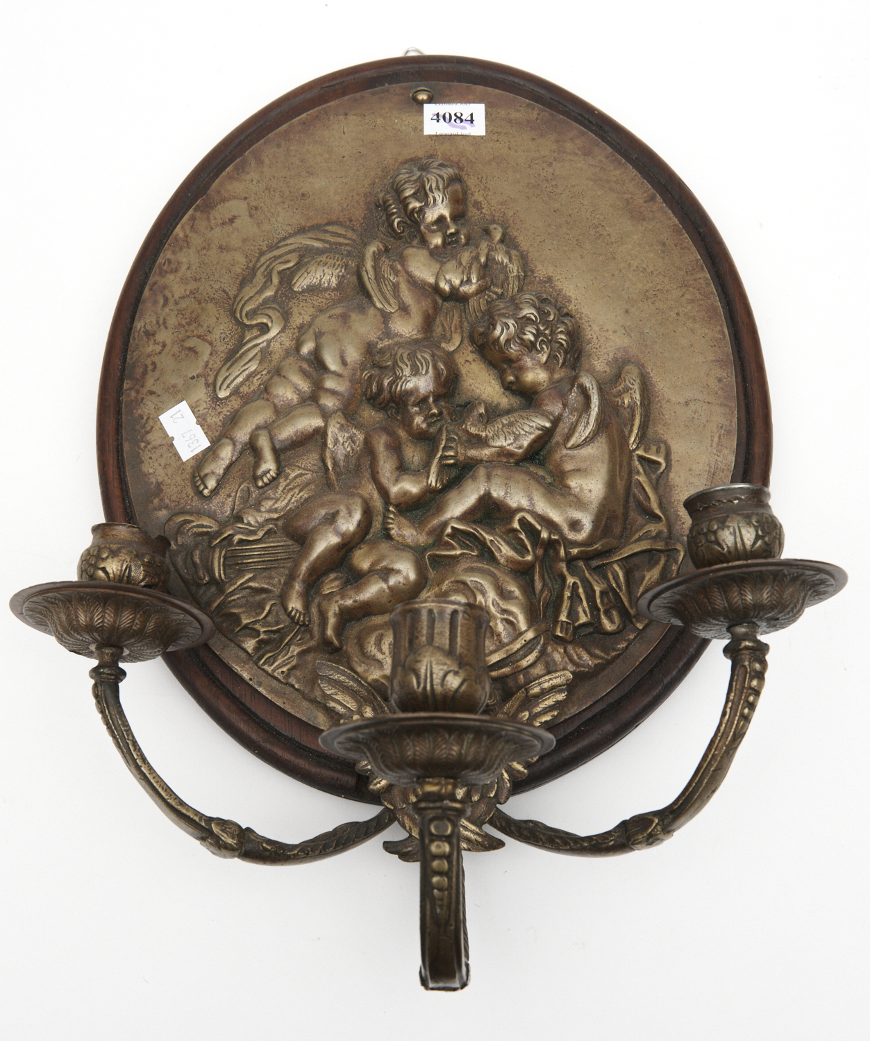 A CHERUB PLAQUE THREE BRANCH WALL SCONCE, 19TH CENTURY, 38CM HIGH