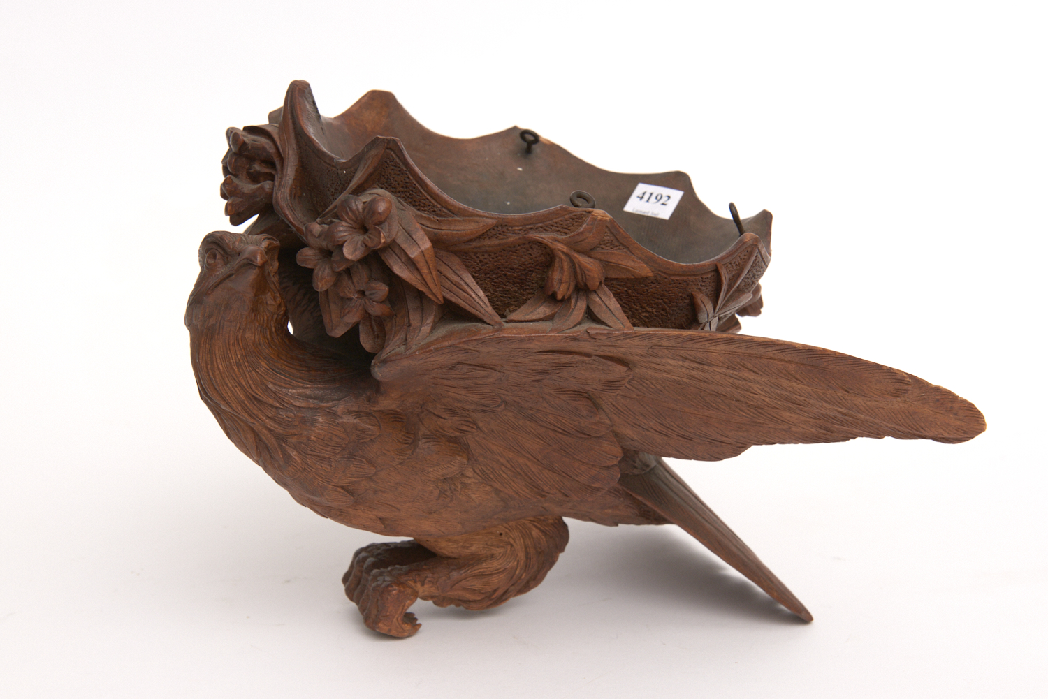 A BLACK FOREST CARVED HANGING CANDLE HOLDER IN THE FORM OF A BIRD, 19TH CENTURY, 31CM LONG