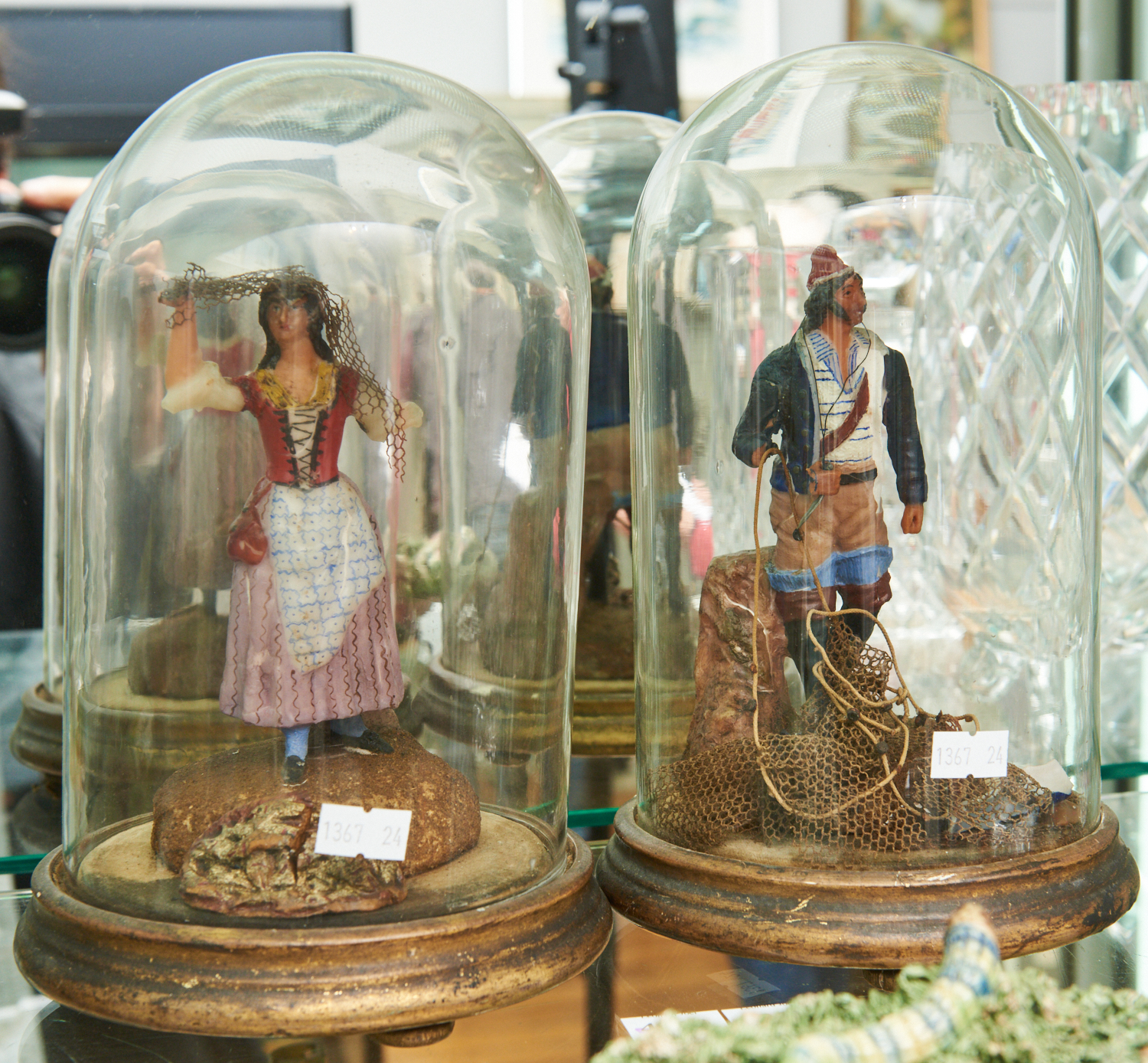 A PAIR OF FRENCH WAX FIGURE DIORAMAS IN GLASS DOMES, EARLY 19TH CENTURY, 25CM HIGH