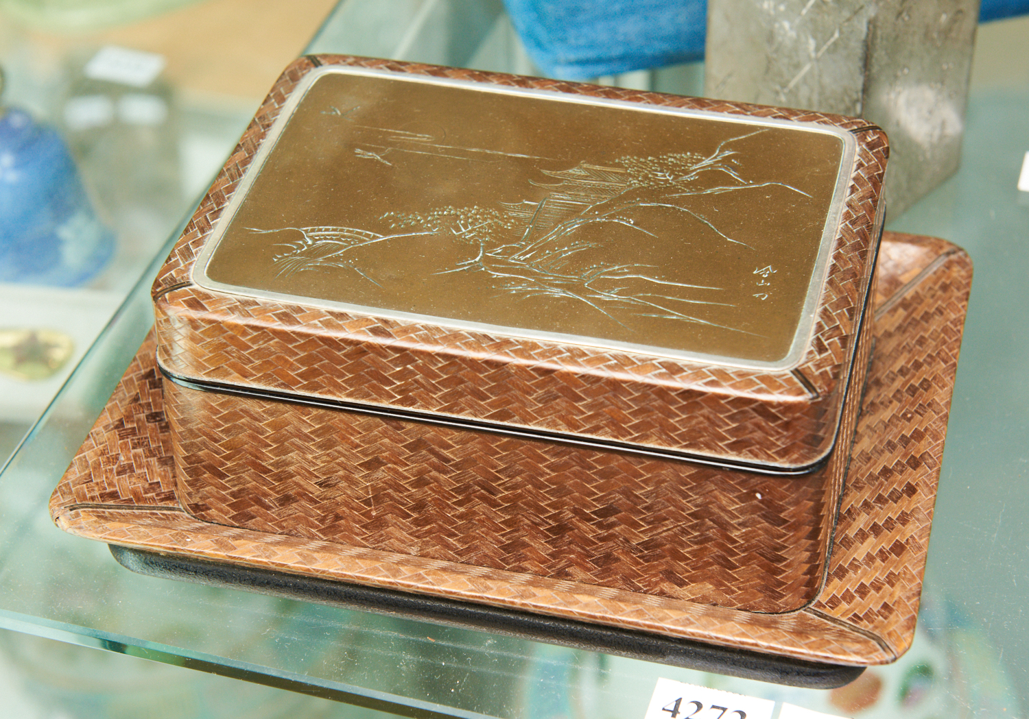 A JAPANESE LACQUER AND PARQUETRY BOX AND TRAY WITH ENGRAVED COPPER LANDSCAPE SCENE PANEL, MEIJI PERIOD, LATE 19TH CENTURY
