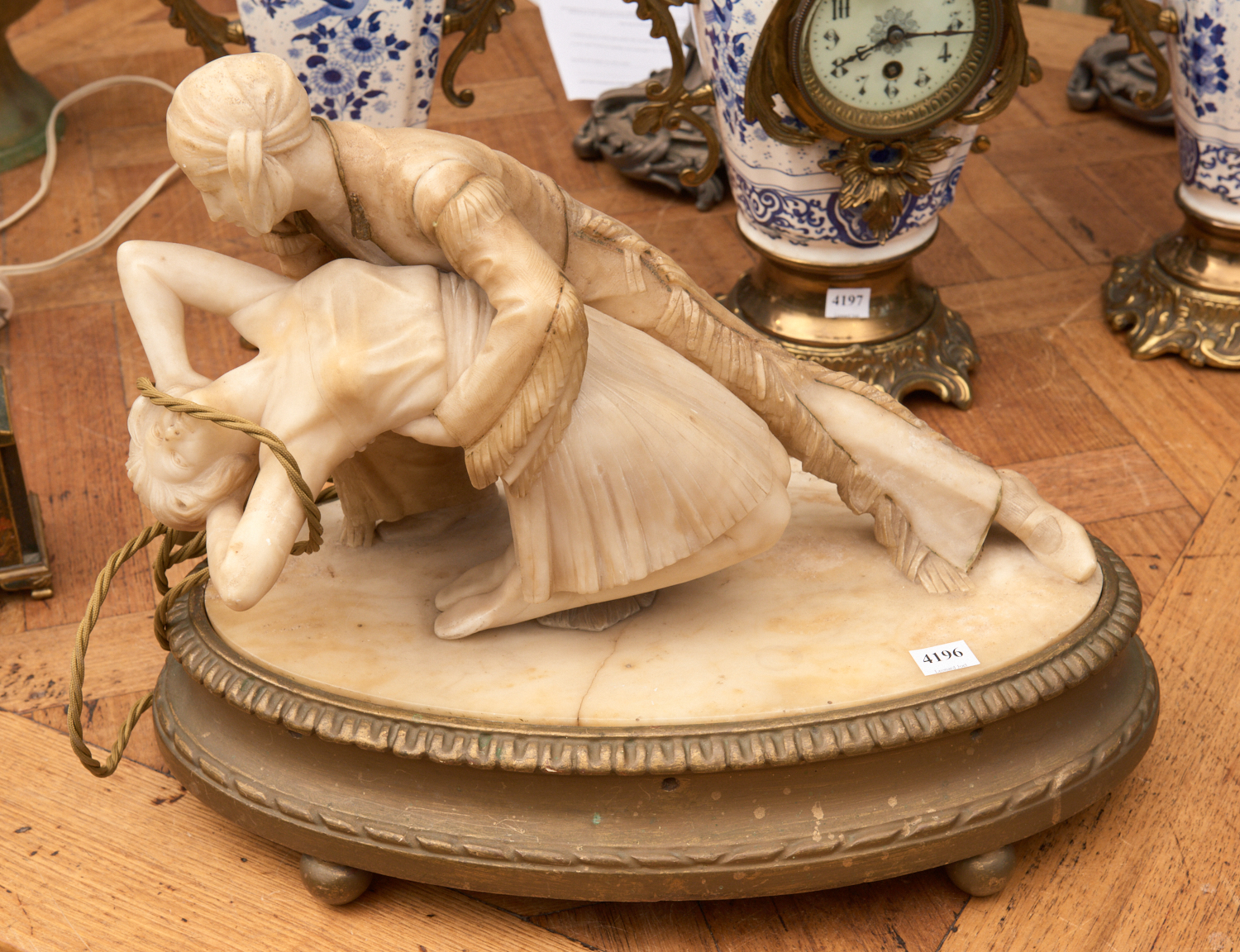 AN ITALIAN CARVED ALABASTER FIGURAL LAMP, SIGNED 'PROF. G. GAMBOGI', CIRCA 1910, 37CM H X 45CM W