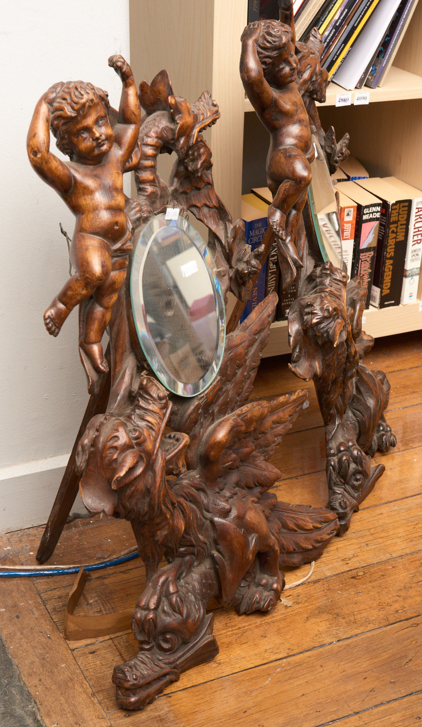 A PAIR OF FRENCH TABLE MIRRORS, ORNATELY CARVED FRUITWOOD WITH CHERUBS AND GRIFFINS, MID 19TH CENTURY, 65CM HIGH
