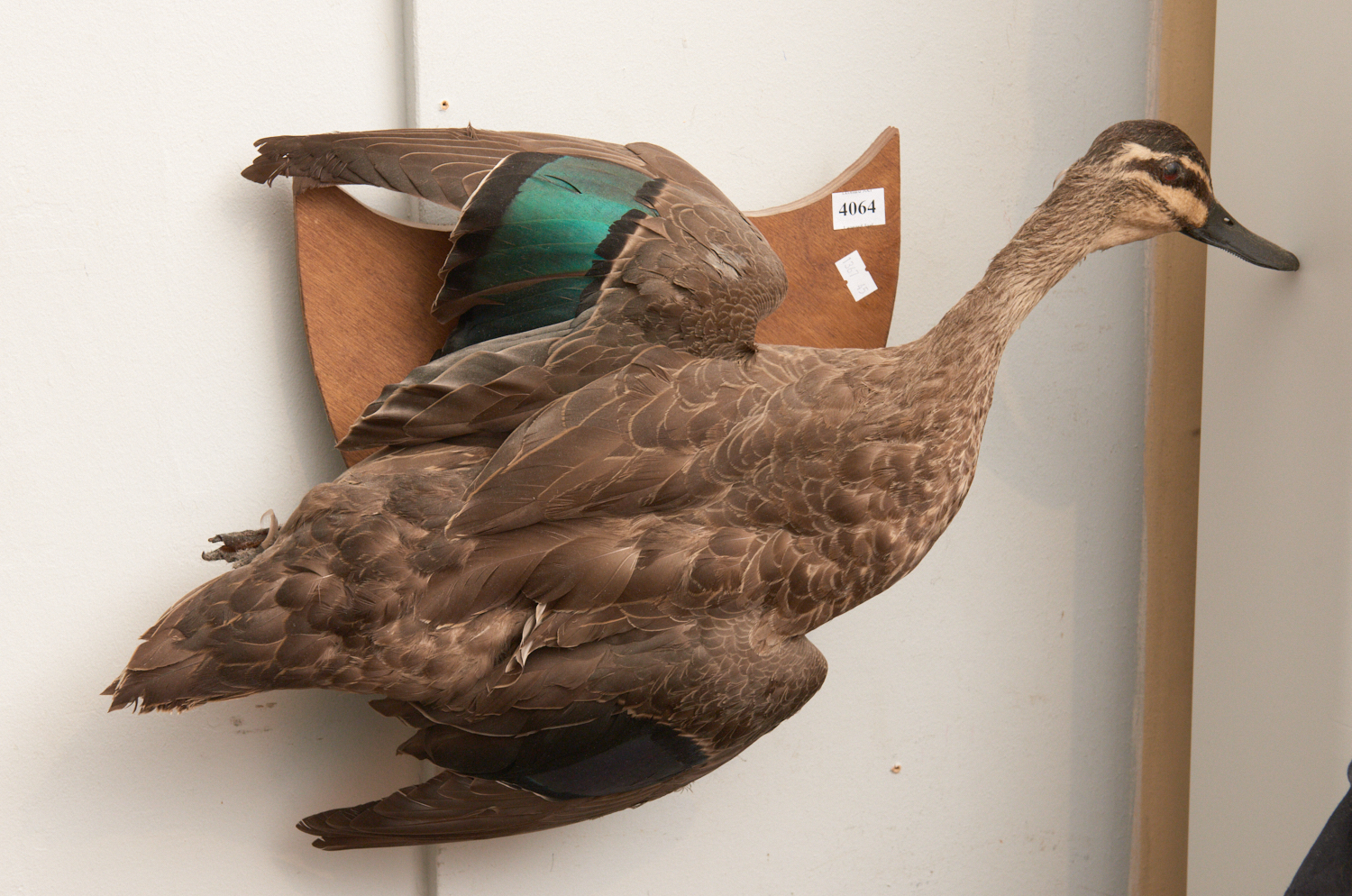 A TAXIDERMIED FEMALE MALLARD DUCK IN FLIGHT ON WOODEN WALL MOUNT, MID 20TH CENTURY, 57CM LONG