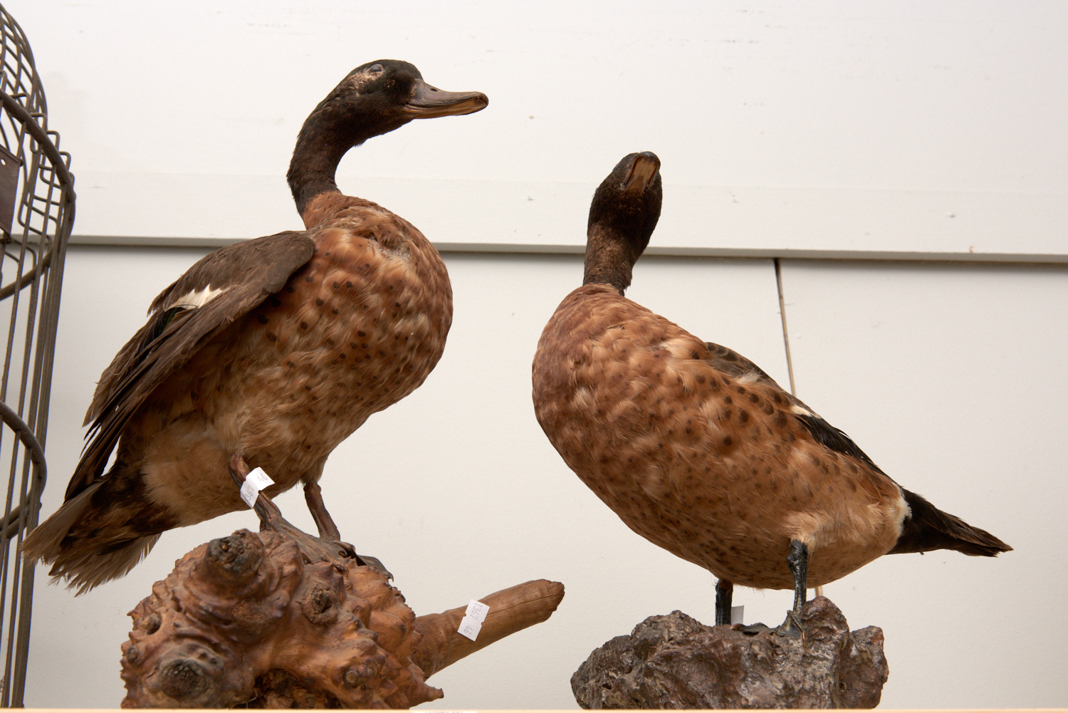 TWO TAXIDERMY DUCKS ON BURL WOOD MOUNTS, EARLY TO MID 20TH CENTURY, 40CM HIGH