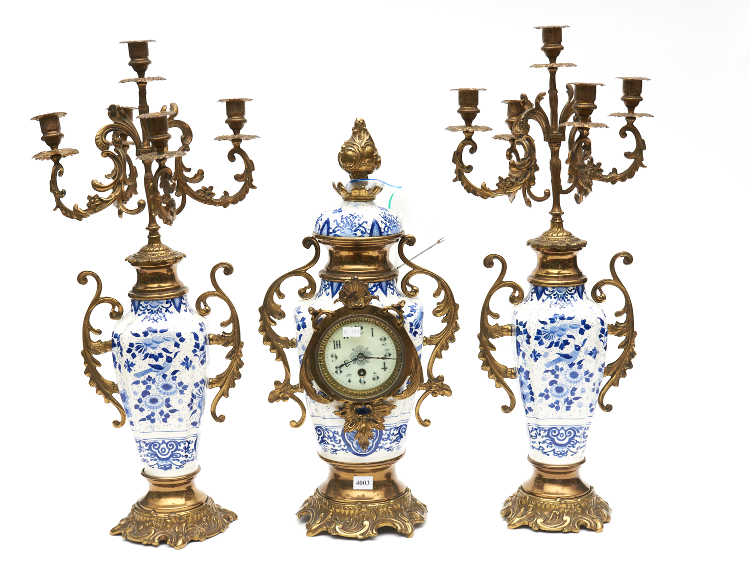 AN ANTIQUE CONTINENTAL GILT METAL MOUNTED PORCELAIN CLOCK GARNITURE, BLUE AND WHITE PORCELAIN WITH GILT METAL MOUNTS AND FIVE BRANCH CANDELABRA, LATE 19TH CENTURY