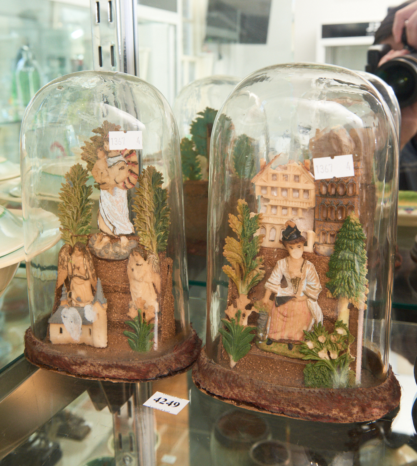 A PAIR OF ANTIQUE WAX MODEL DIORAMAS IN ORIGINAL GLASS DOMES, EARLY 19TH CENTURY, 22CM OVERALL