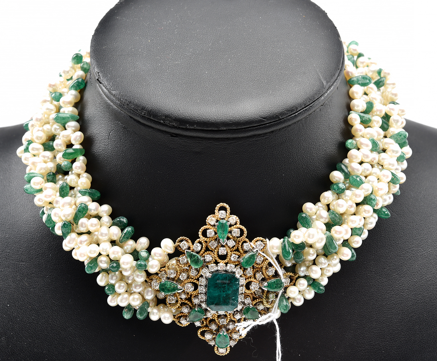 A SYNTHETIC EMERALD, GREEN PASTE AND SEED PEARL MULTI-STRAND NECKLACE, CLASP IN 14CT GOLD