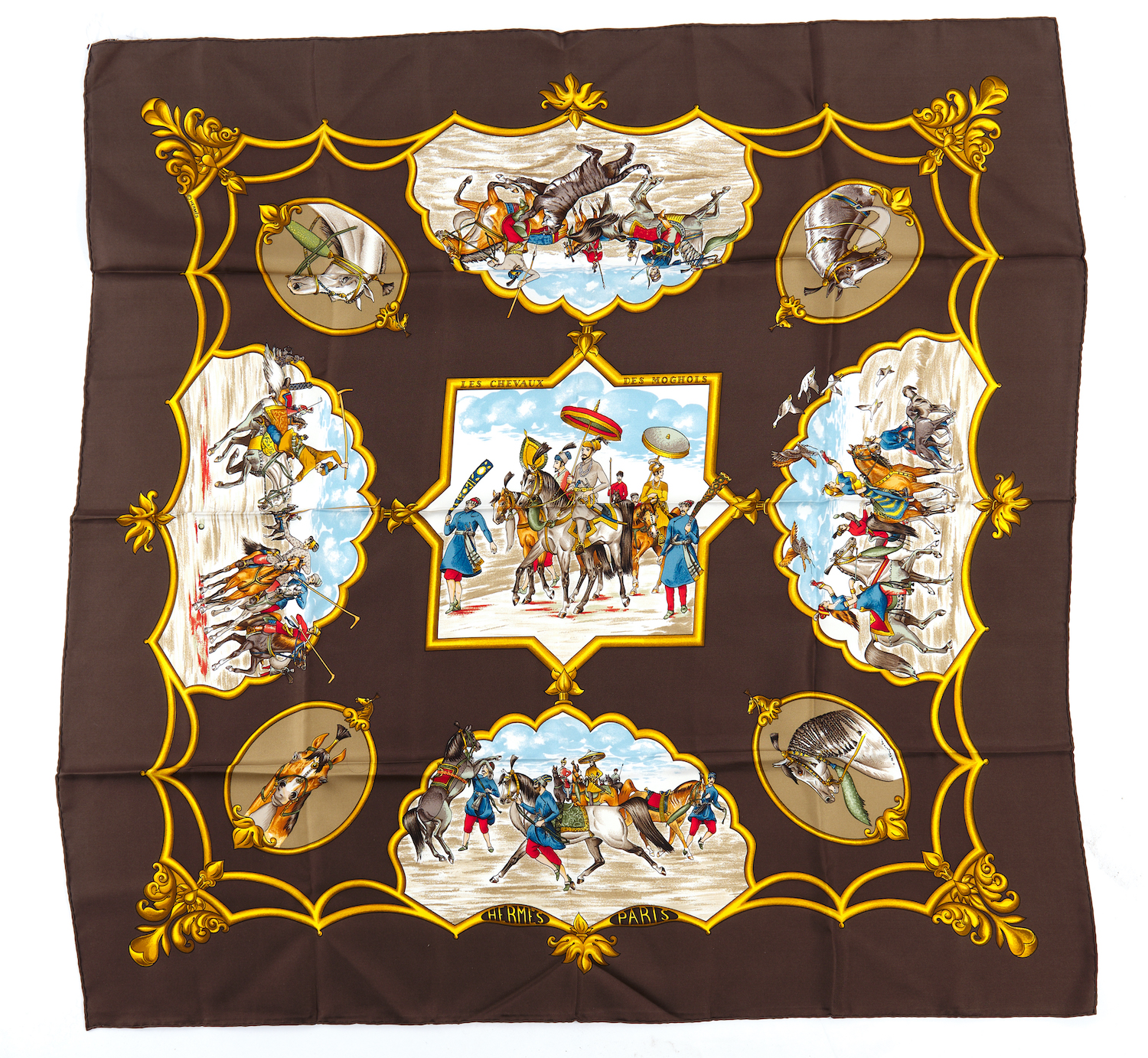 The 'Les Chevaux Des Moghols' design by Jean De Fougerolle, on brown background, 90cm square.