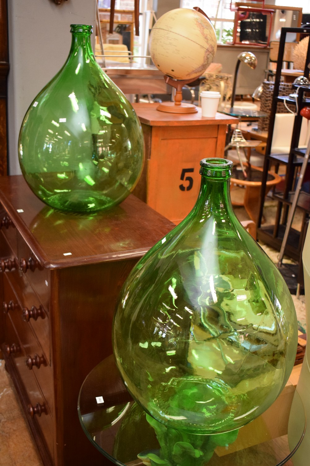 TWO LARGE GREEN GLASS DEMI JOHNS