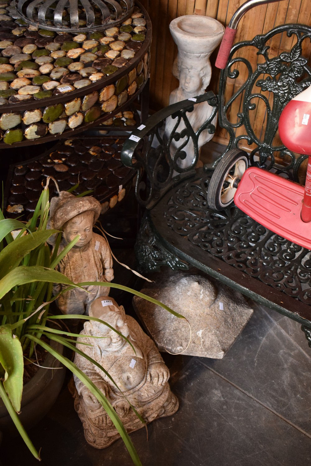 A COLLECTION OF CONCRETE PIECES INCLUDING A BUDDHA, TWO BOYS, AND A CHINESE HUT