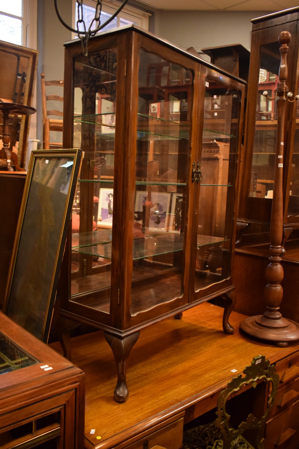 A TIMBER AND GLASS DISPLAY CABINET (KEY IN OFFICE)