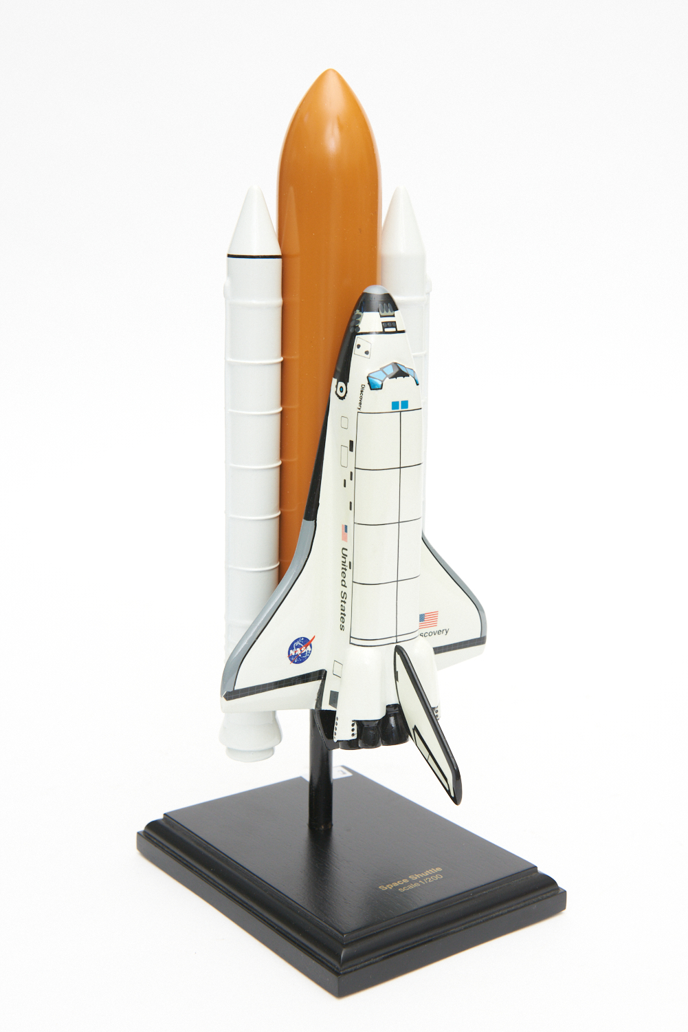 A DETAILED STATIC MODEL OF A BOEING VERTICAL FULL STACK SHUTTLE, PAINTED WOOD, 1:200 SCALE, WITH BOX, 33.5 CM HIGH