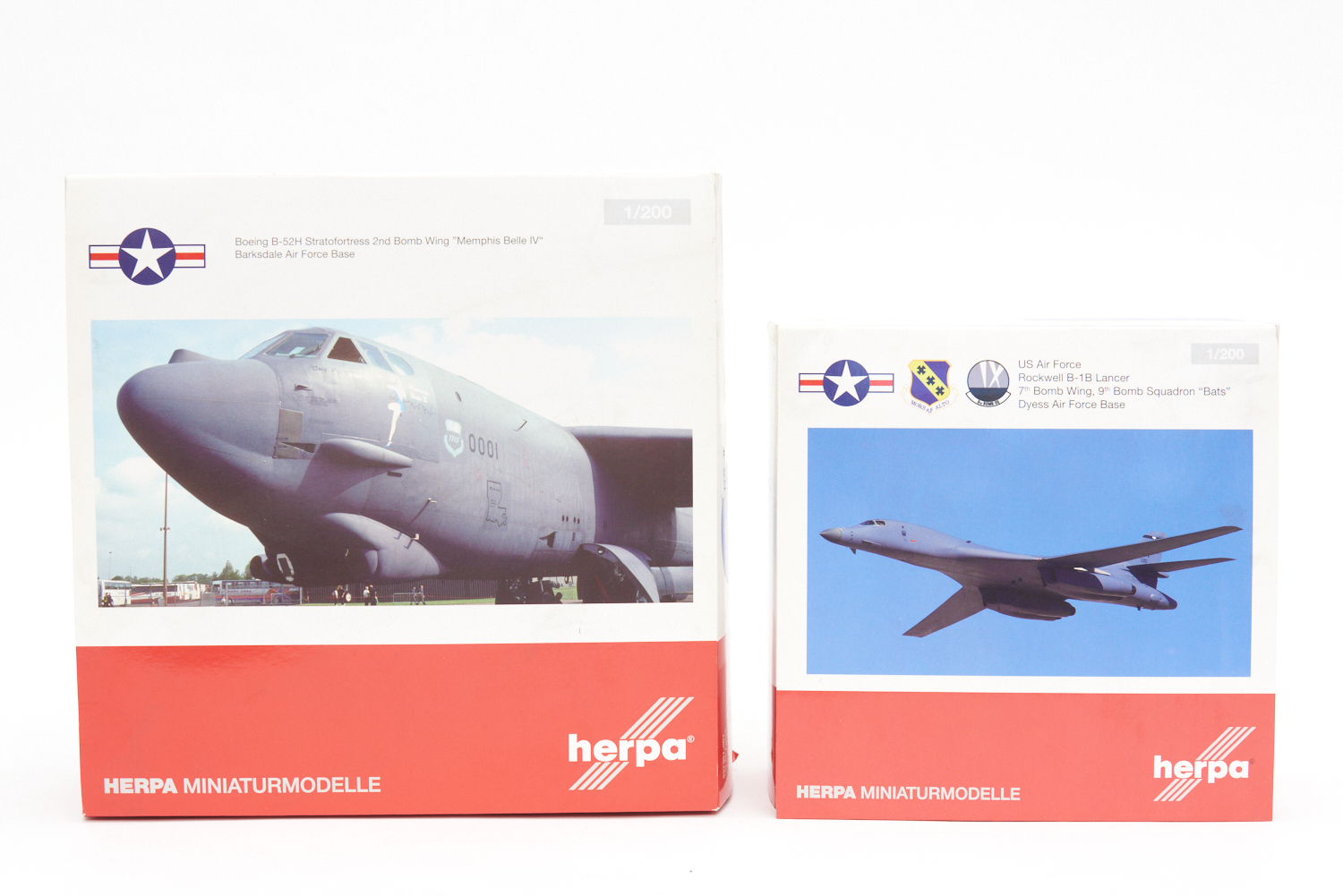 TWO BOXED HERPA MODEL PLANES, INCLUDING A BOEING B-52H STRATOFORTRESS 'MEMPHIS BELLE IV'; AND A US AIR FORCE B-1B LANCER JET, BOXED