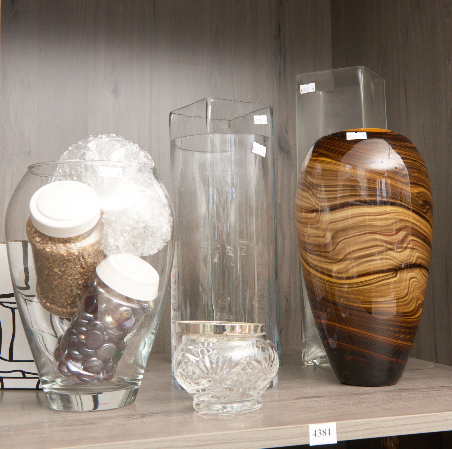 FIVE CLEAR GLASS VASES AND A BROWN SWIRL DESIGN VASE