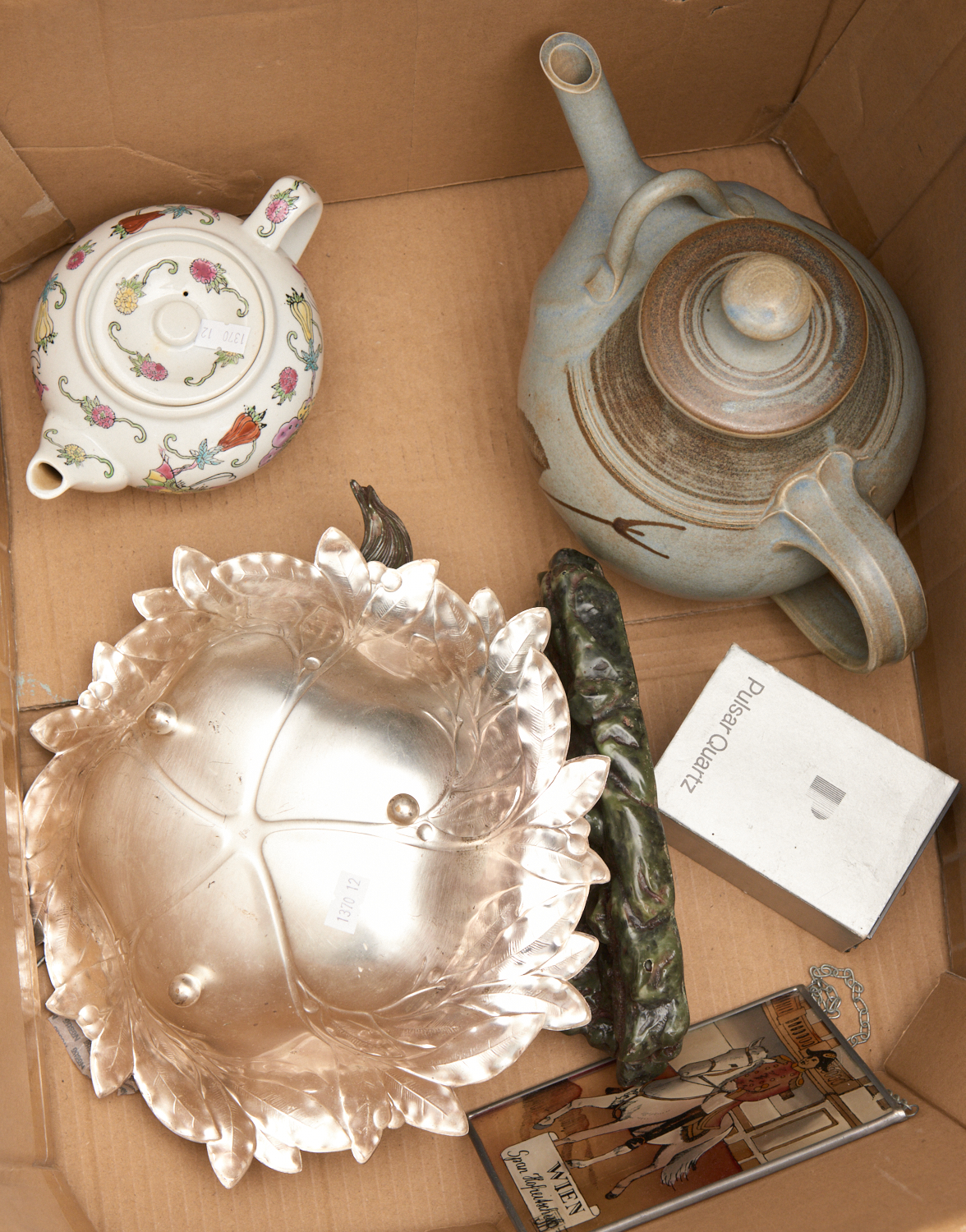 A BOX OF VINTAGE ITEMS INCLUDING TEAPOTS, BOWL, ETC.