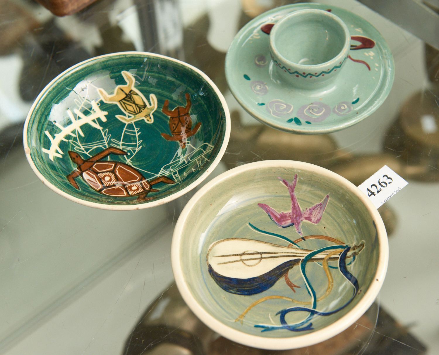 THREE MARTIN BOYD CERAMIC ITEMS, EGG CUP AND TWO PIN DISHES