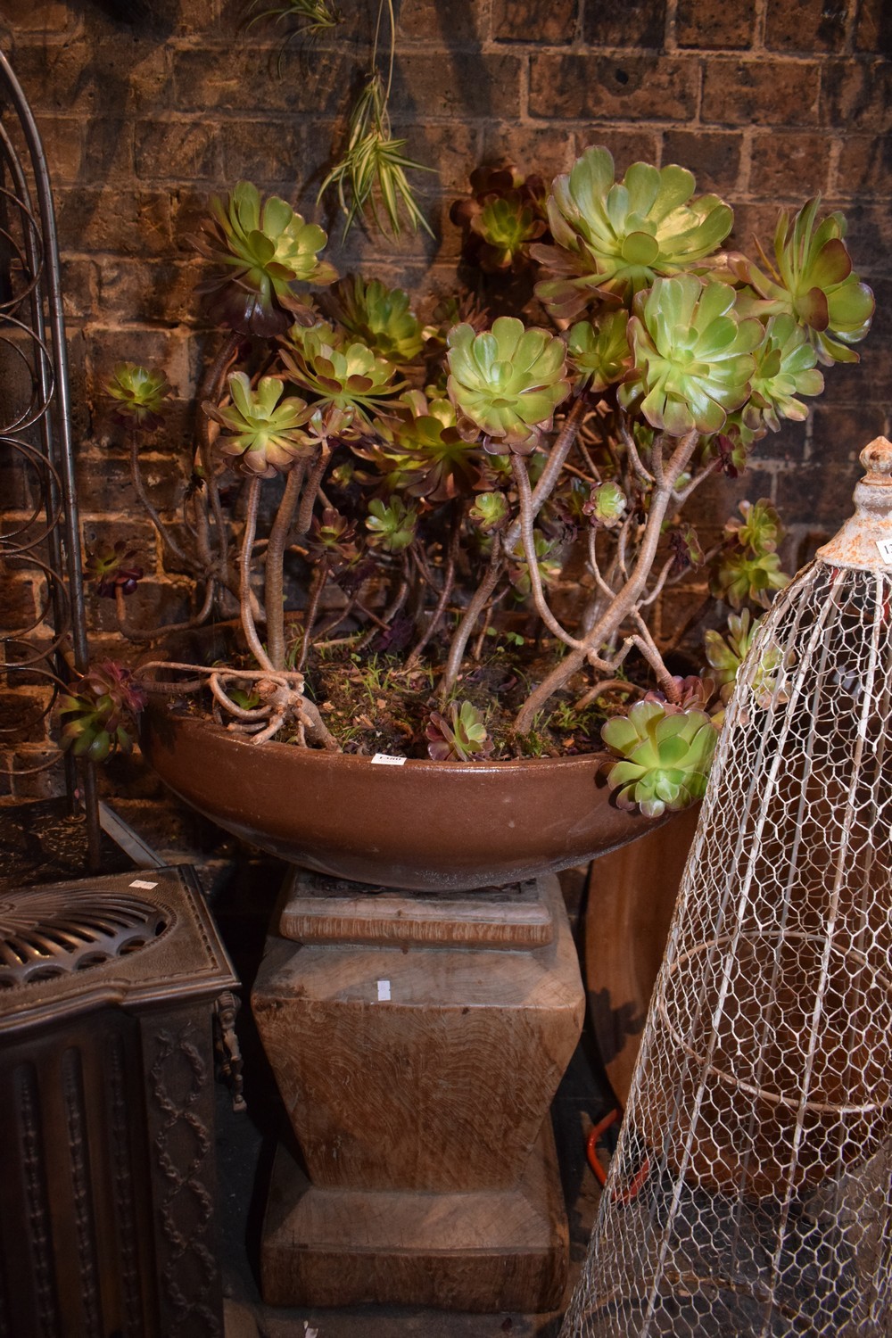 A GLAZED CIRCULAR POT ON WOODEN PEDASTAL