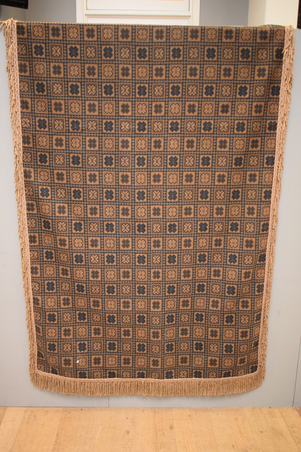 A QUALITY UPHOLSTERED THROW RUG IN TONES OF BLUE AND GOLD (390 X 240CM)