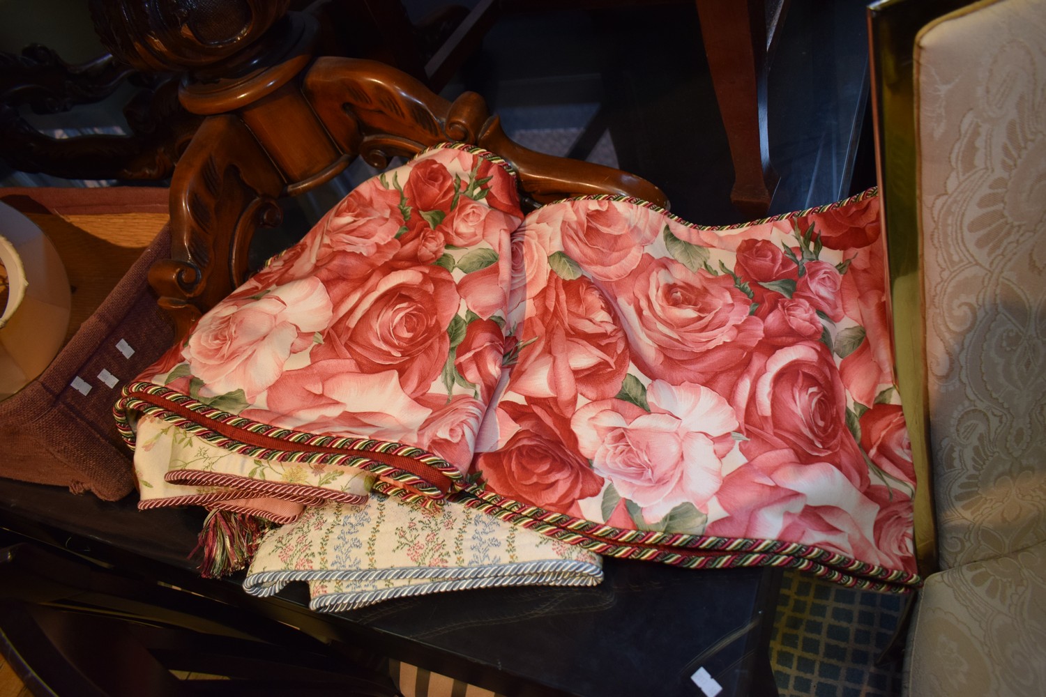 A COLLECTION OF THREE BED THROWS IN QUALITY UPHOLSTERED FABRICS WITH TRIMS AND TASSELS (135 X 294CM)