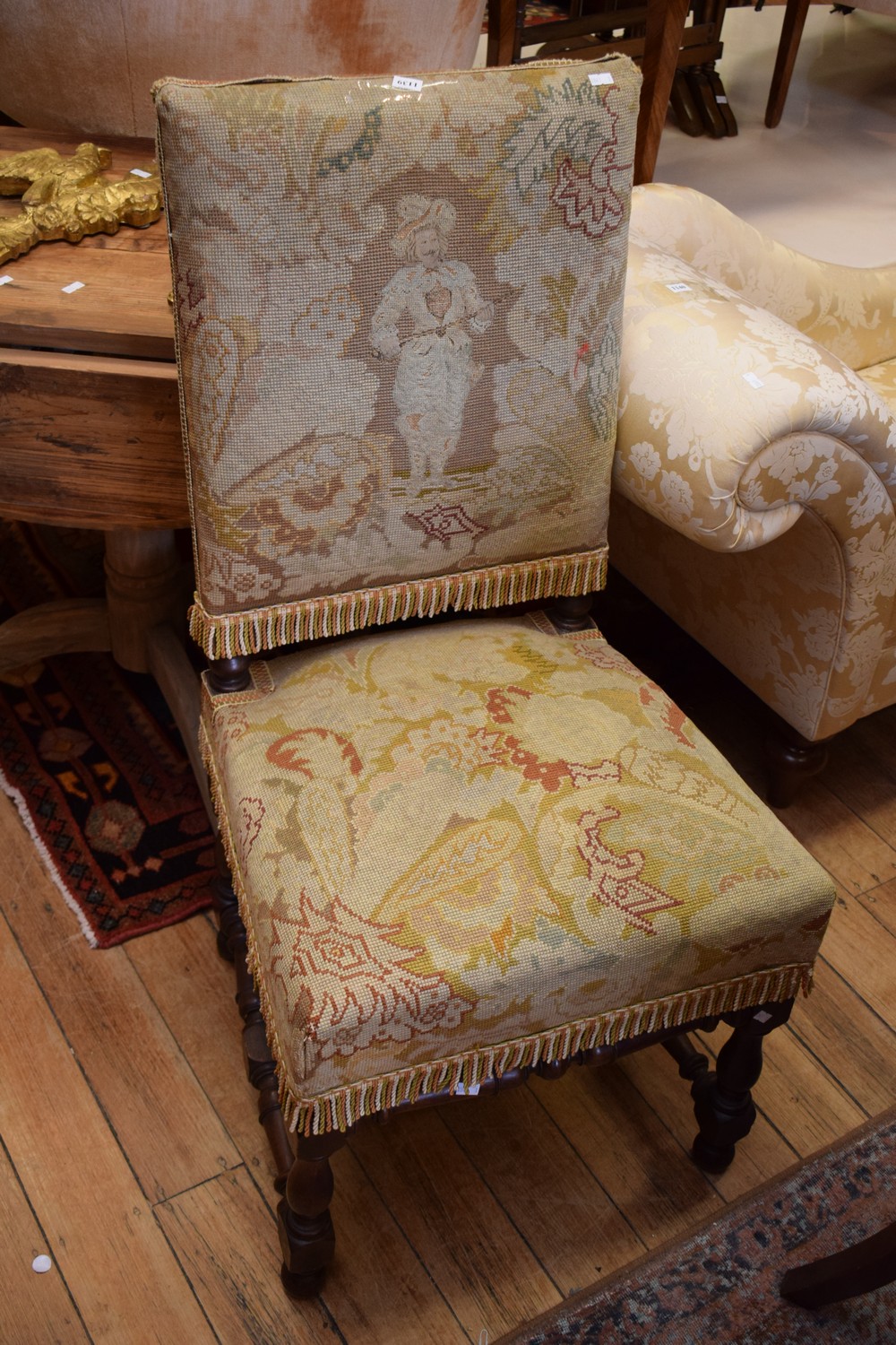 A PAIR OF FRENCH 19TH CENTURY TAPESTRY HALL CHAIRS WITH DETAILED IMAGES OF A MAN AND WOMAN (A/F - DAMAGE TO BACK LINING, MISSING FABRIC)