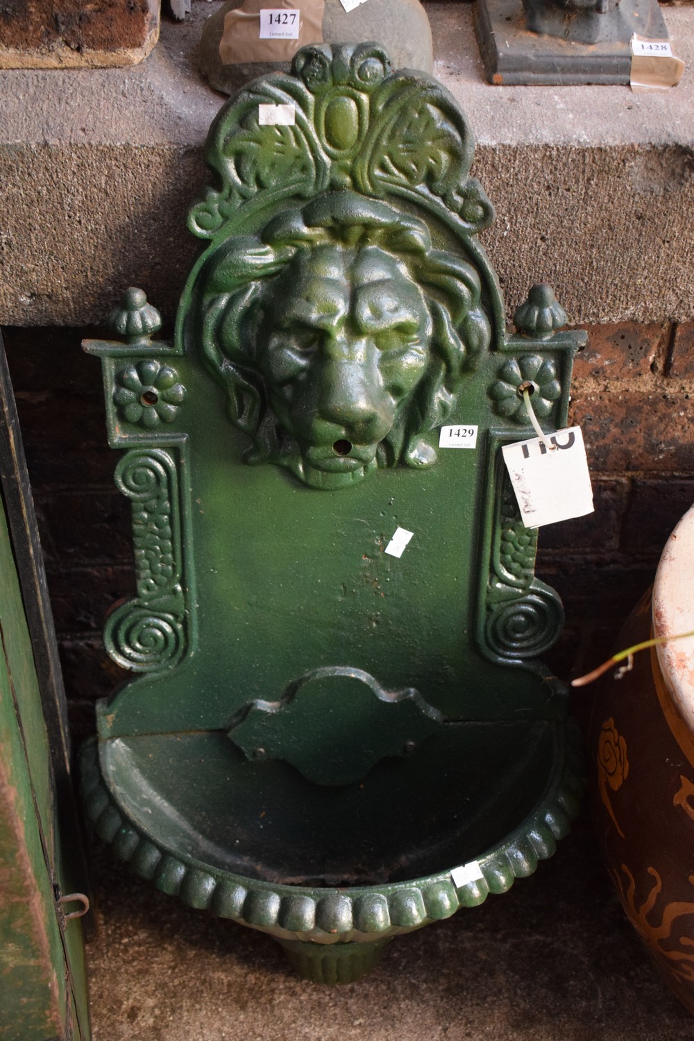 A CAST IRON WALL FOUNTAIN WITH LION MOTIF