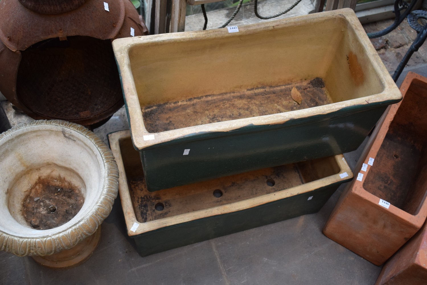 A PAIR OF GREEN GLAZED TERRACOTTA PLANTERS