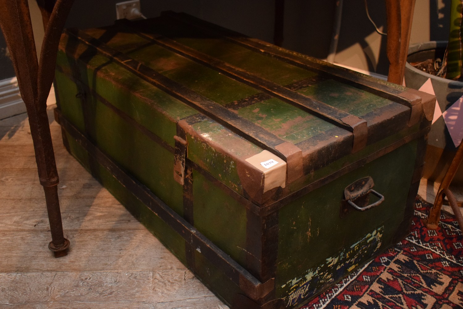 A GREEN TRAVELLER'S TRUNK (A/F) (40H X 100W X 50D CM)