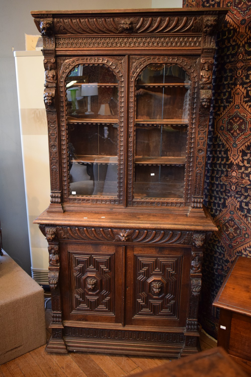 A CONTINENAL ORNATELY CARVED OAK BOOKCASE IN THE RENAISSANCE STYLE, 19TH CENTURY, 227H x 115w x 48D CM (PLEASE NOTE THIS ITEM MUST BE REMOVED BY CLIENTS OR CARRIERS AT THE CUSTOMERS EXPENSE)