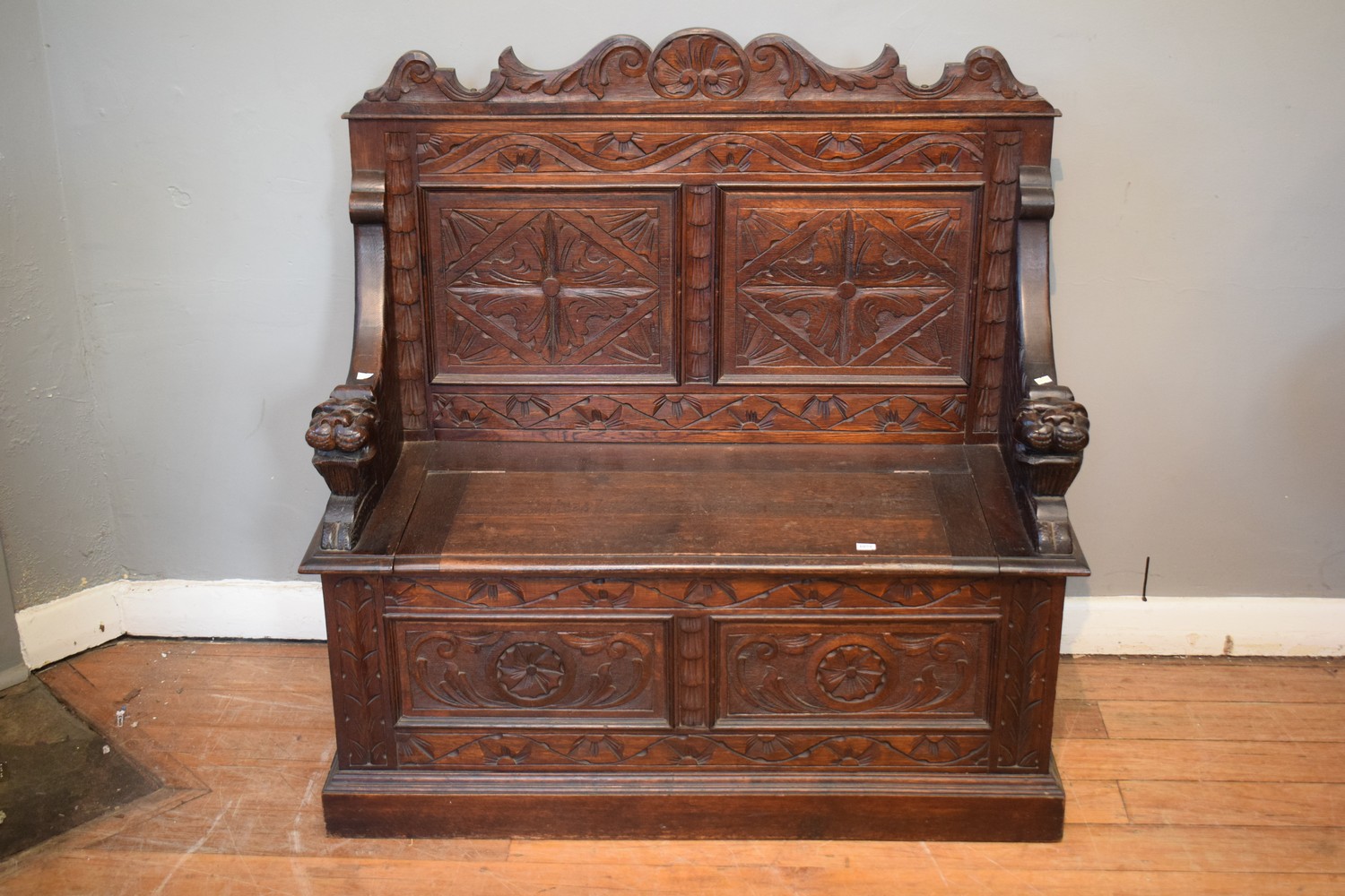 A 19TH CENTURY CONTINENTAL HALL SEAT WITH CARVED OAK LION'S HEAD GRIPS (108H x 107W x 42D CM)