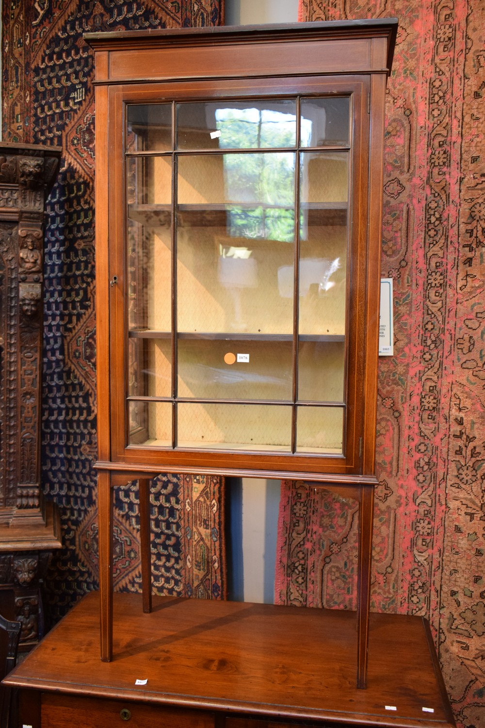 AN ENGLISH SHERATON REVIVAL DISPLAY CABINET MADE OF WALNUT WITH STRING INLAY, EARLY 20TH CENTURY (KEY IN OFFICE) (142H x 65W x 32D CM)