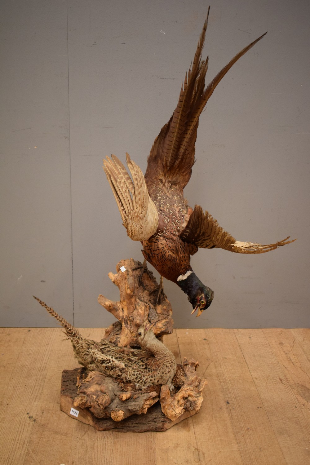 A TAXIDERMY PHEASANT DISPLAY WITH TWO BIRDS MOUNTED ON BURL TIMBER, 20TH CENTURY, 105CM HIGH