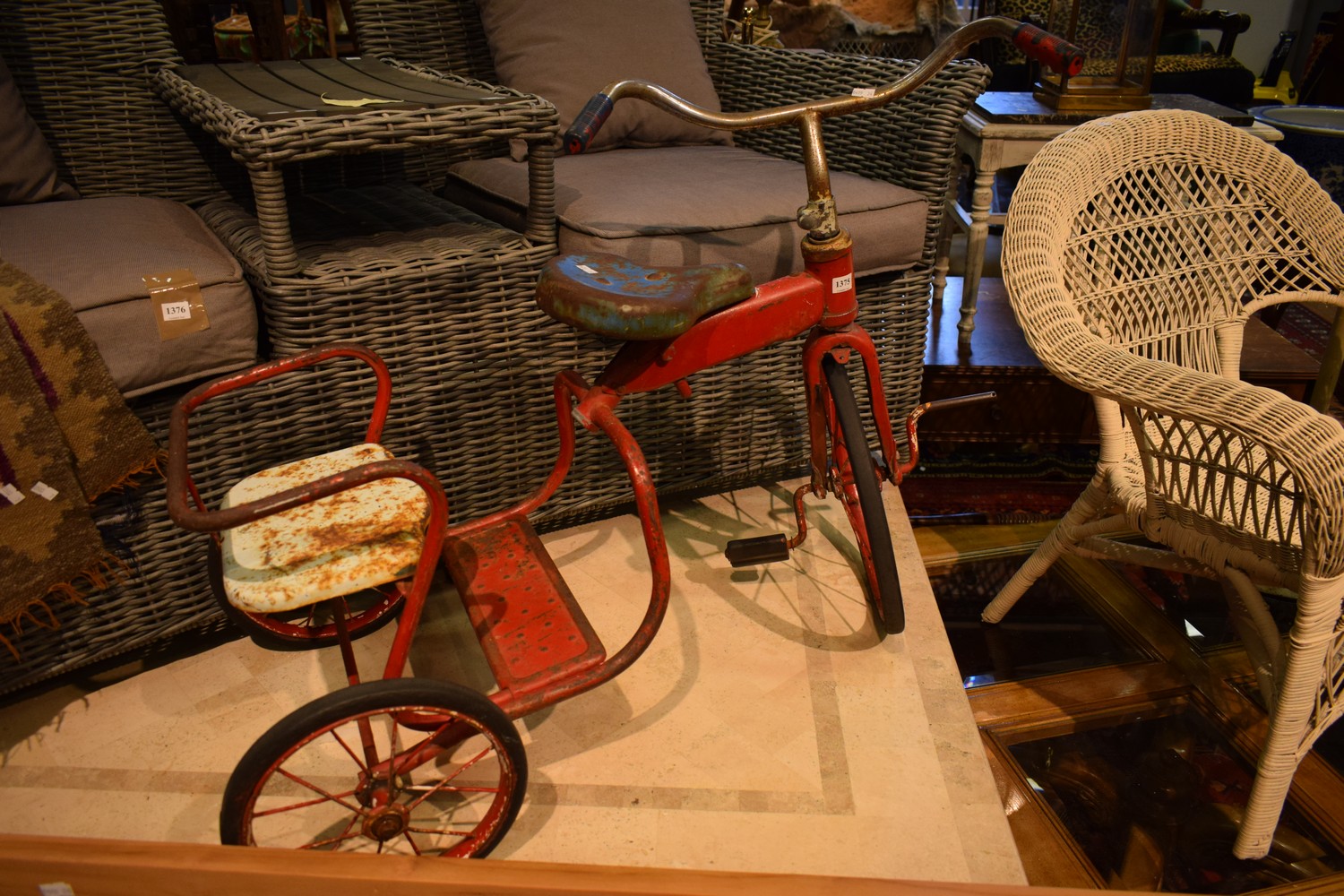 A VINTAGE TRICYCLE WITH RED AND BLUE PAINTED FINISH, MID 20TH CENTURY, 72CM HIGH