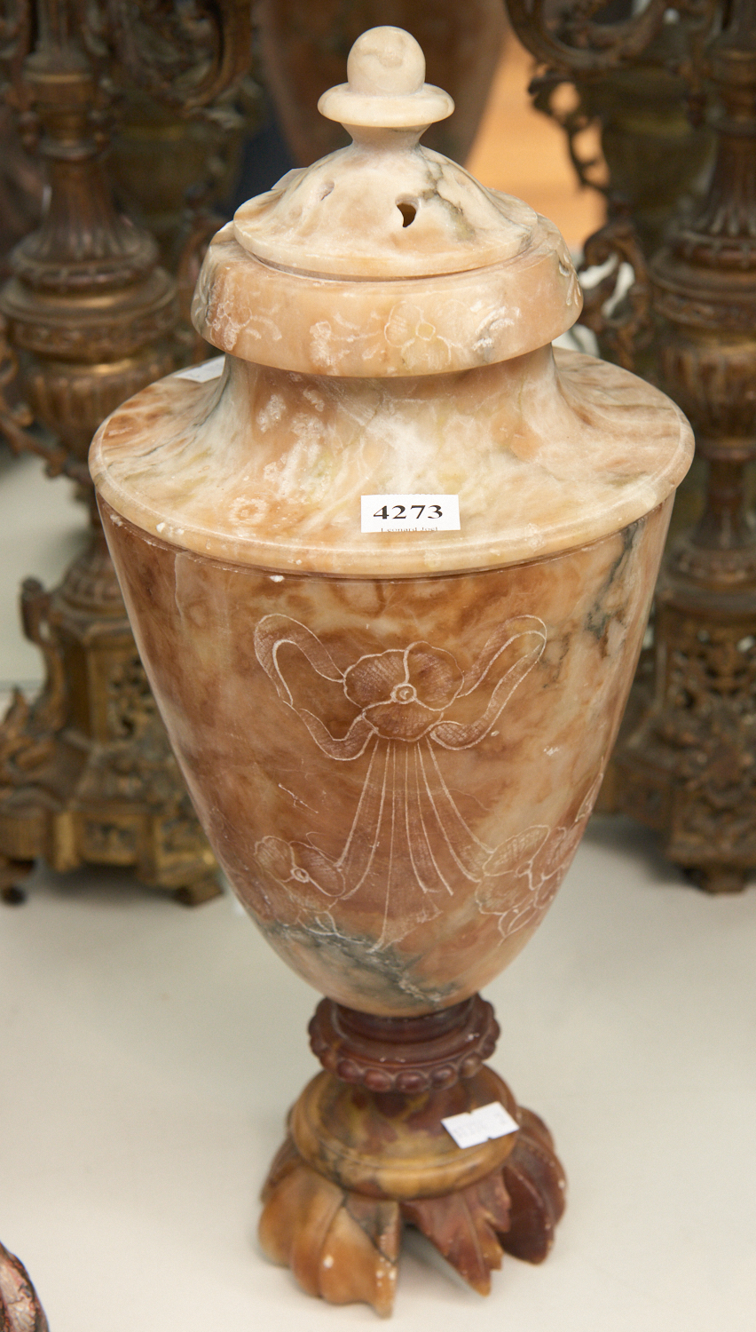 AN ALABASTER LIDDED URN (CONVERTED FROM A STANDARD LAMP)