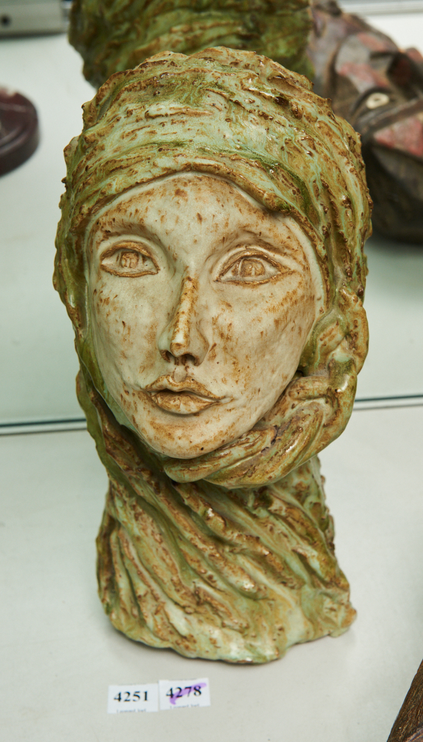 A GLAZED POTTERY BUST OF A WOMAN, 30 CM HIGH