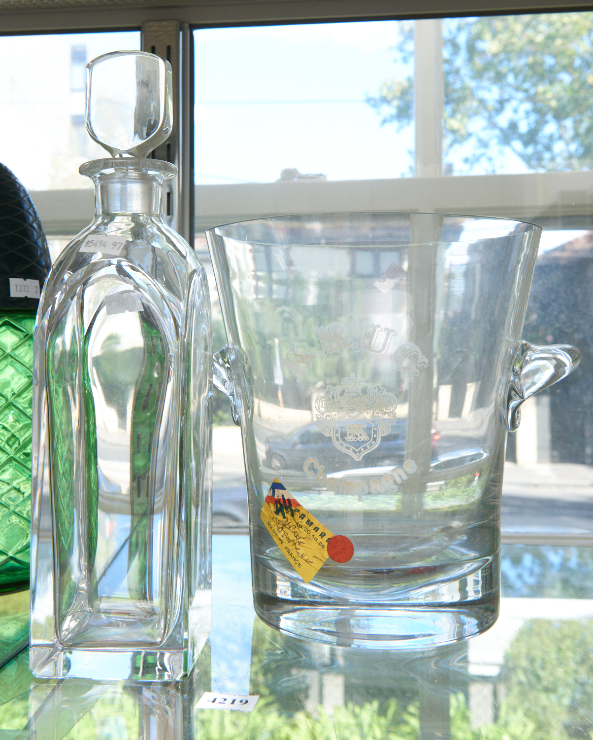 AN ORREFORS DECANTER AND 'KRUG' GLASS ICE BUCKET