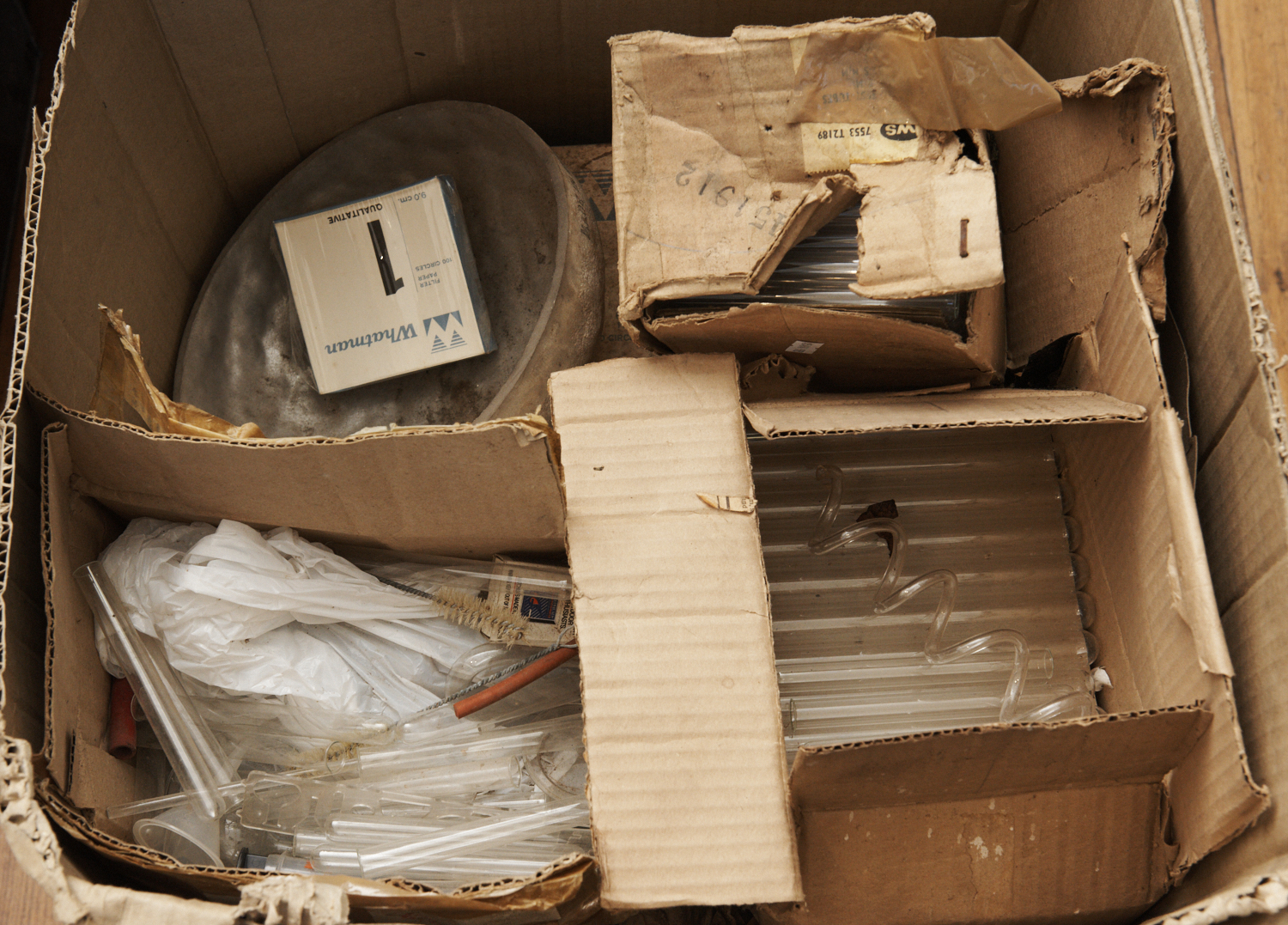 A LARGE COLLECTION OF ASSORTED CHEMISTS RELATED ITEMS INCL. GLASS FLASKS