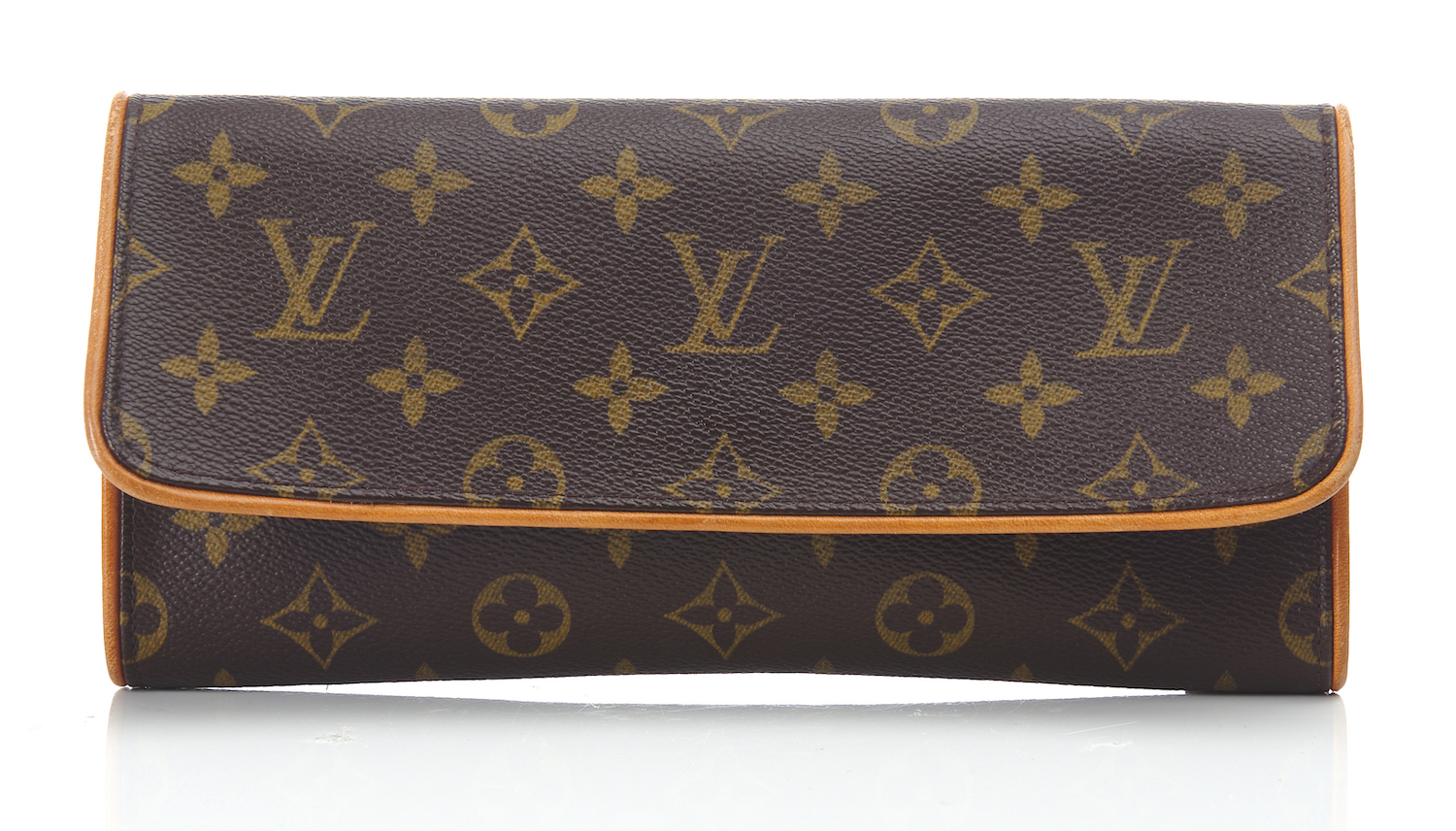 Styled in monogram coated canvas with tan leather trim and gold metal hardware, 11.5 x 25 x 3cm.