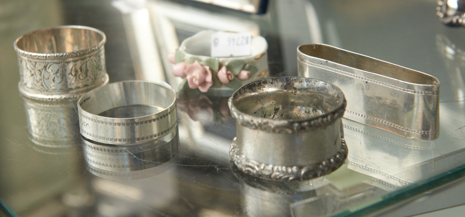 A COLLECTION OF NAPKIN RINGS, INCLUDING THREE STERLING SILVER, ONE EPNS AND ONE PORCELAIN