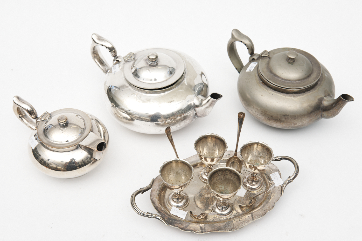 TWO ROBUR TEAPOTS (NO INFUSERS), WATER JUG AND EGG CRUET ON STAND