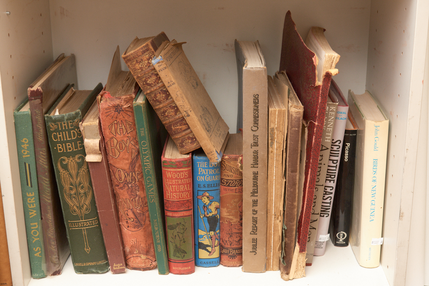 A SHELF OF VINTAGE BOOKS INCLUDING BOYS OWN ANNUAL JUBILEE REPORT OF THE MELBOURNE HARBOUR TRUST COMMISSION