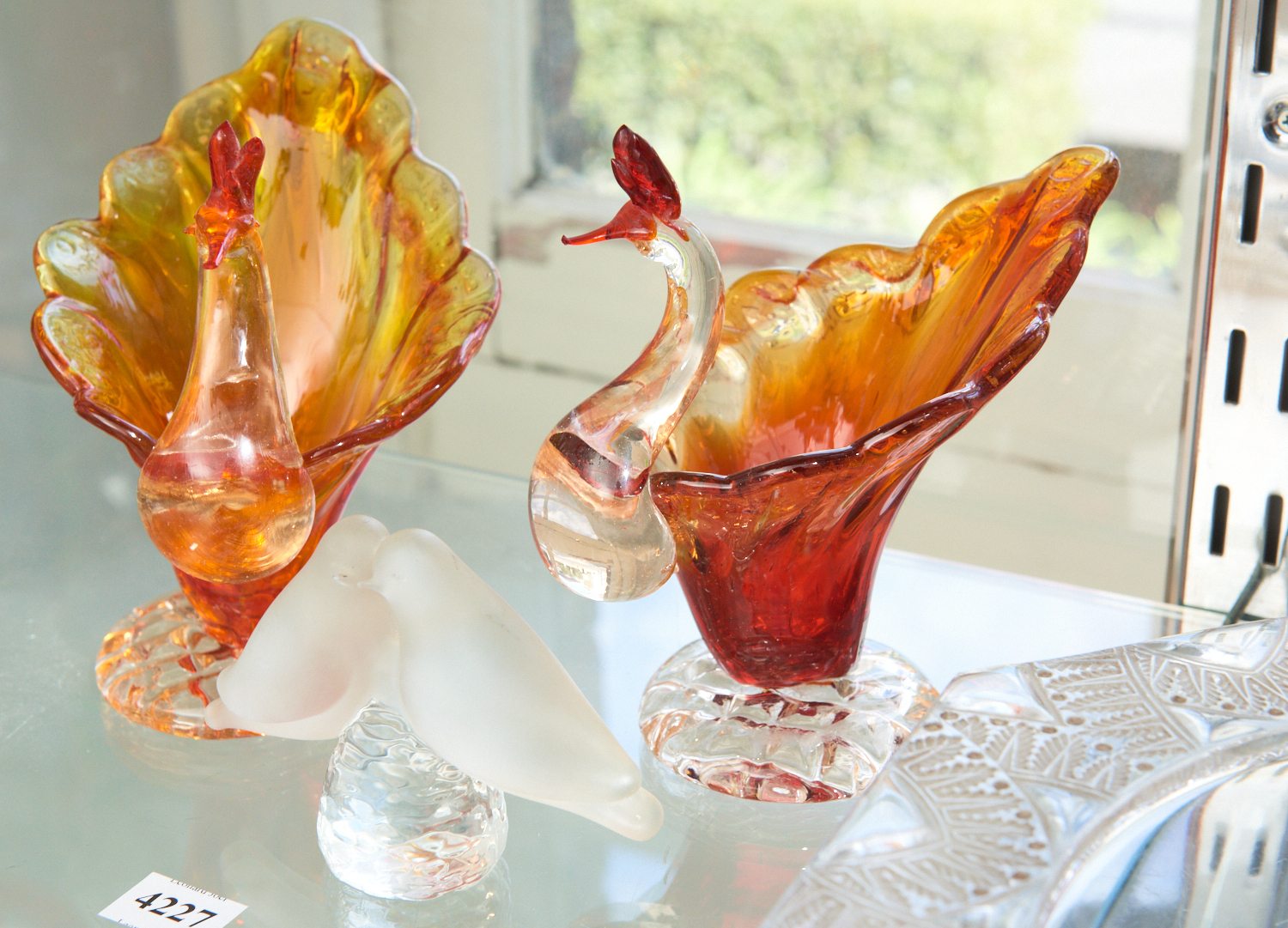 A GROUP OF FROSTED GLASS BIRDS TOGETHER WITH COLOURED GLASS BIRDS