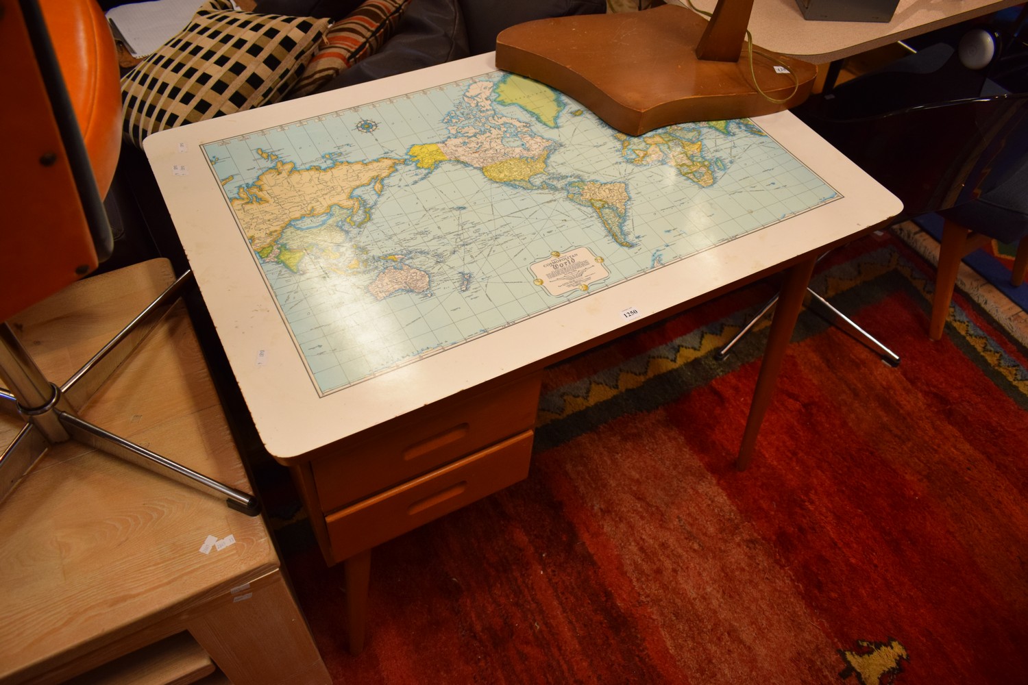 A MID CENTURY TWO DRAWER DESK WITH WORLD MAP TOP ( A/F TO LEGS )