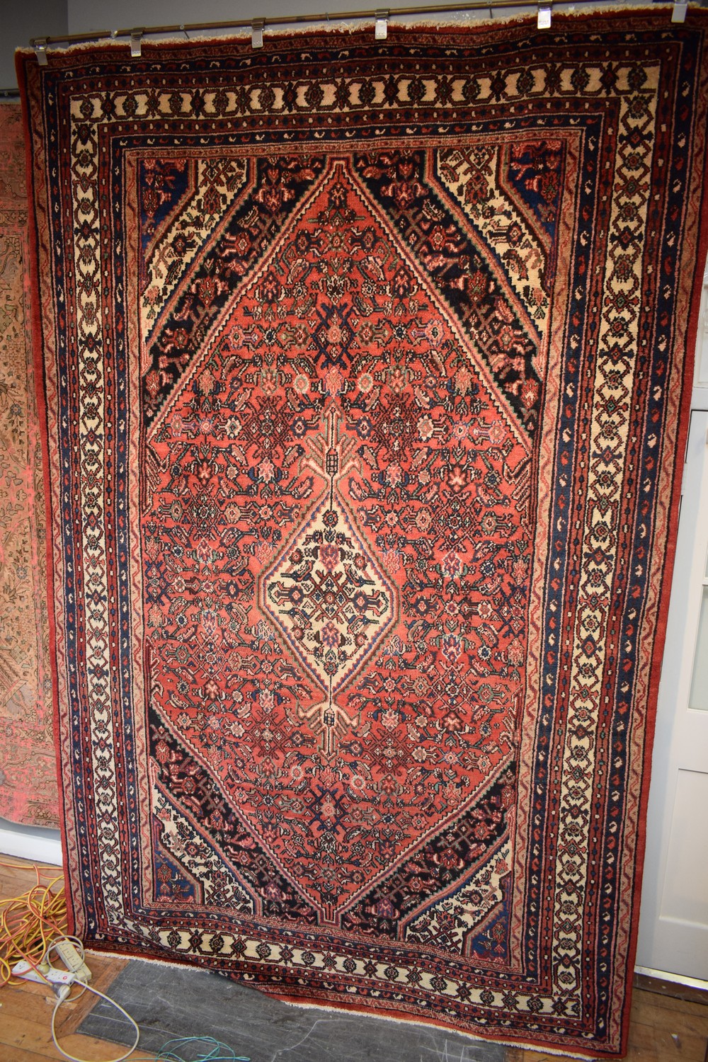 A PERSIAN HOSSAINABAD RUG, 100% DENSE WOOL PILE IN EXCELLENT CONDITION, HAND KNOTTED VILLAGE WEAVE FROM THE HAMADAN REGION WITH TRIBAL DESIGN OF ANCHORED MEDALLION AND QUARTERED CORNER MEDALLIONS IN A RED TONED FIELD OF BOLD HERATI MAHI PATTERNS, SIZE 316 X 212CM, ORIGIN PERSIA, RRP $2,900