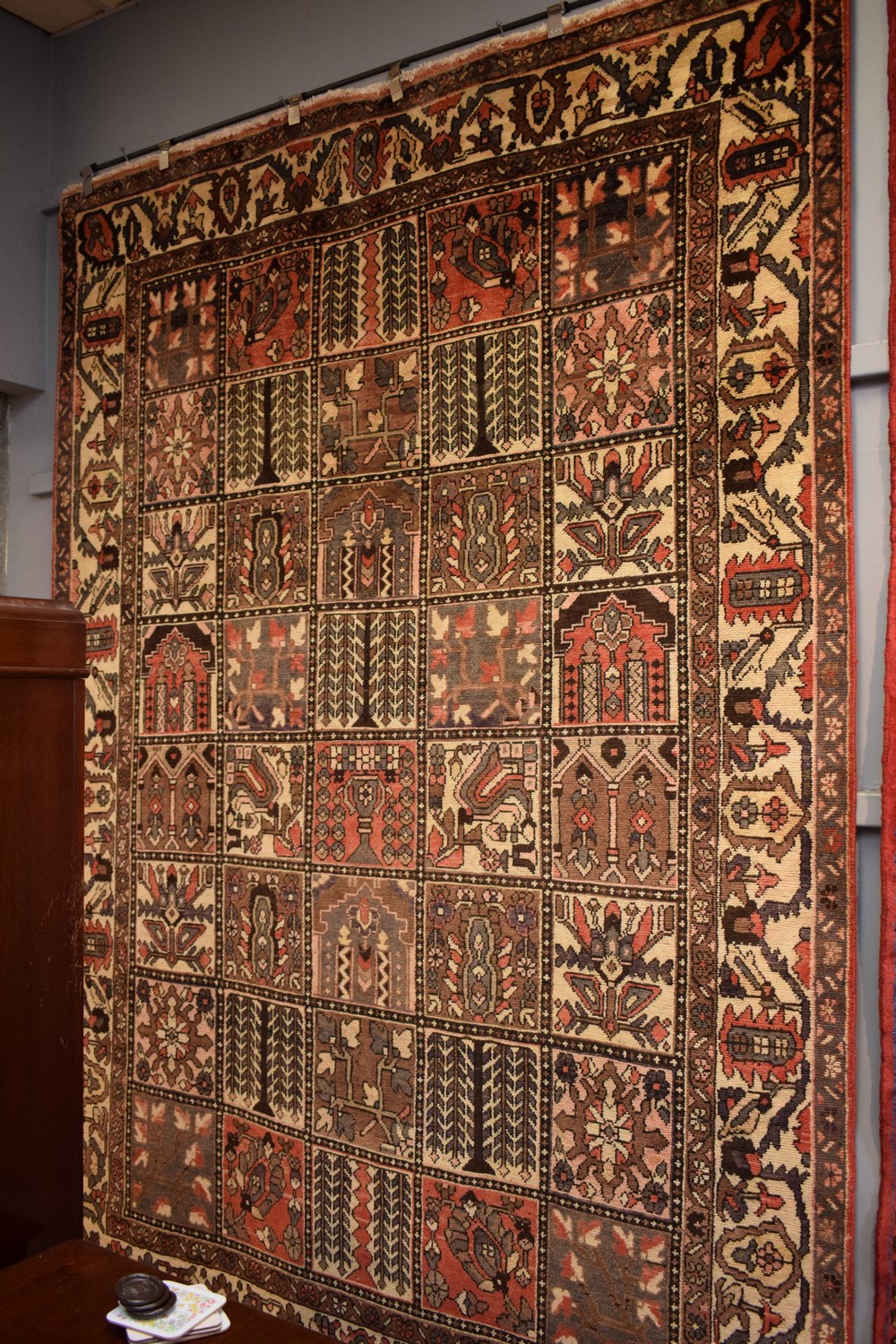 A TRIBAL PERSIAN BAKHTIAR RUG, 100% WOOL IN EXCELLENT CONDITION, HAND KNOTTED TRIBAL BAKHTIARI WEAVE WITH TRADITIONAL 'GARDEN' DESIGN WITH PANELS CONTAINING GARDEN THEMES OF WILLOW TREES, FLORAL SHRUBS, PALMETTES AND PRAYER NICHES, BORDER OF PALMETTES AND TENDRILS, SIZE 306 X 214CM, ORIGIN PERSIA, RRP $3,300